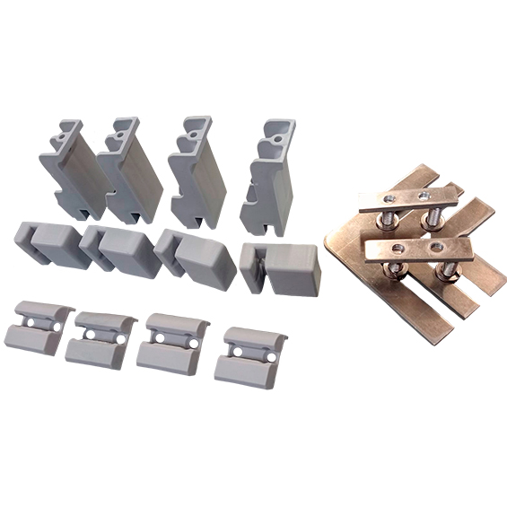 Kit de armado para cancel Río Bravo en escuadra. Soporta ÚNICAMENTE vidrio de 6 mm. Acabado natural. Material: polipropileno. Escuadra de fijación de aluminio.