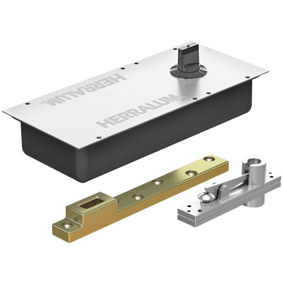 Descripción:Bisagra de piso para puertas de vidrio templado, con freno en ambas posiciones y accesorios.