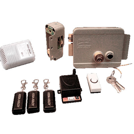 Cerradura eléctrica kit 321D, transformador, 3 controles remotos, receptor y botón.