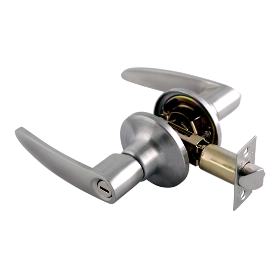 Cerradura de manija función ranura - botón con mecanismo tubular. Backset ajustable de 60 o 70 mm. Para espesor de la puerta 30 a 42 mm. Sirve para puertas derechas o izquierdas.